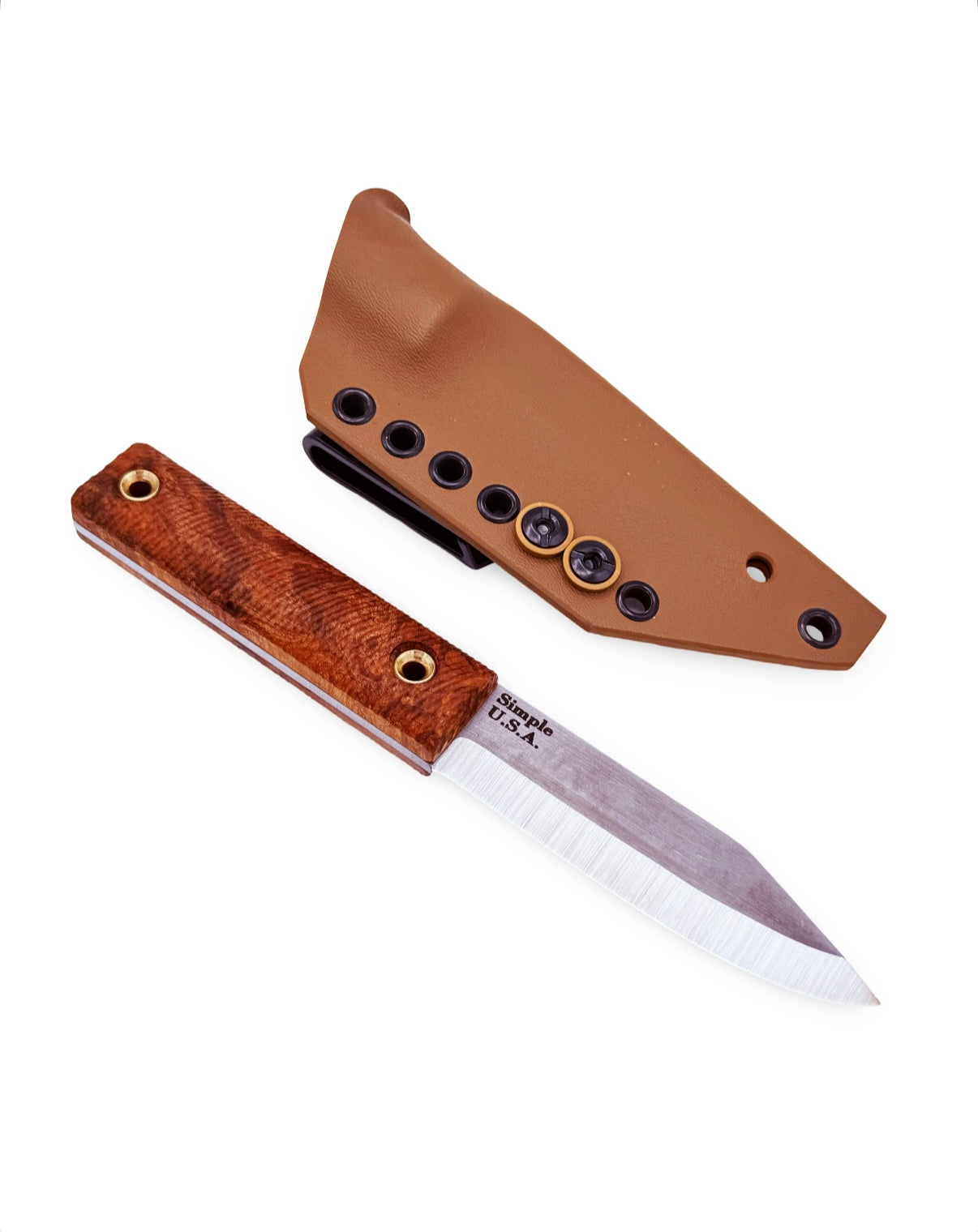 The quintessential Bushcraft knife must be sharp, comfortable, and easy to sharpen. Bushcraft knives should have the blade tip close to the center line of the handle with an oval cross-section and be free of protruding guards and finger grooves. The Simple checks all the boxes–and more!