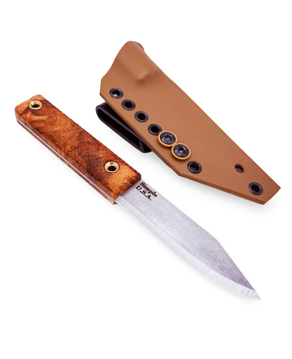 The quintessential Bushcraft knife must be sharp, comfortable, and easy to sharpen. Bushcraft knives should have the blade tip close to the center line of the handle with an oval cross-section and be free of protruding guards and finger grooves. The Simple checks all the boxes–and more!