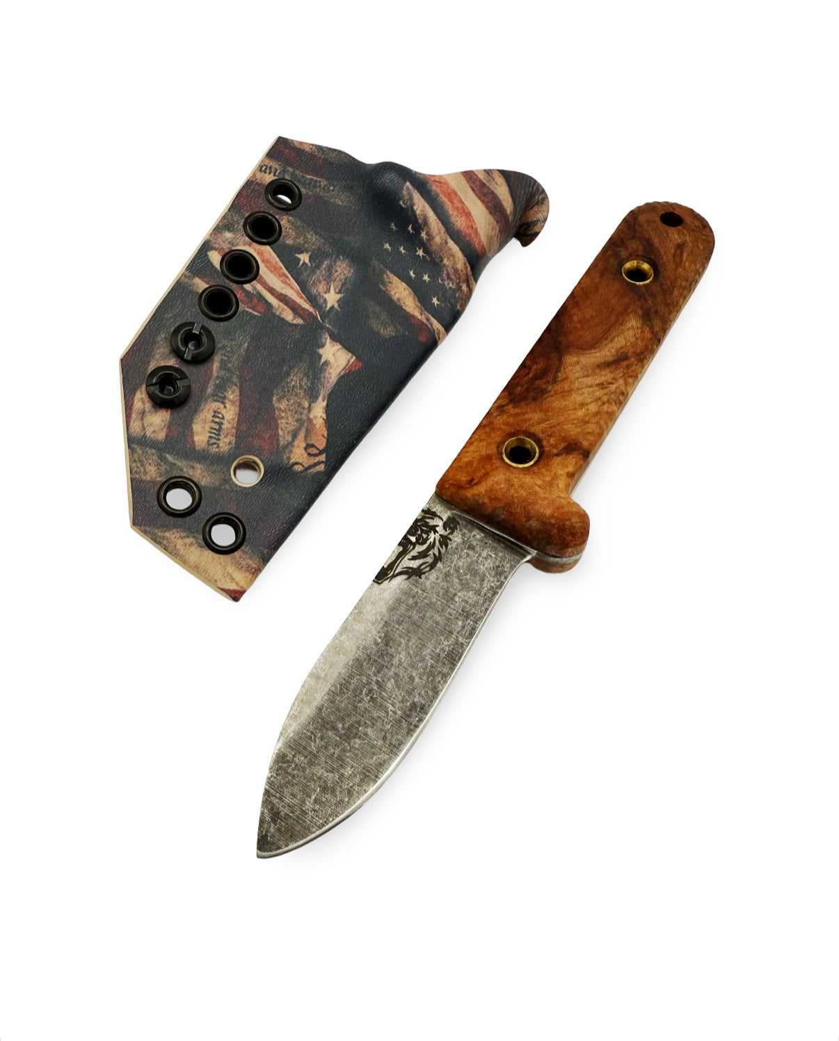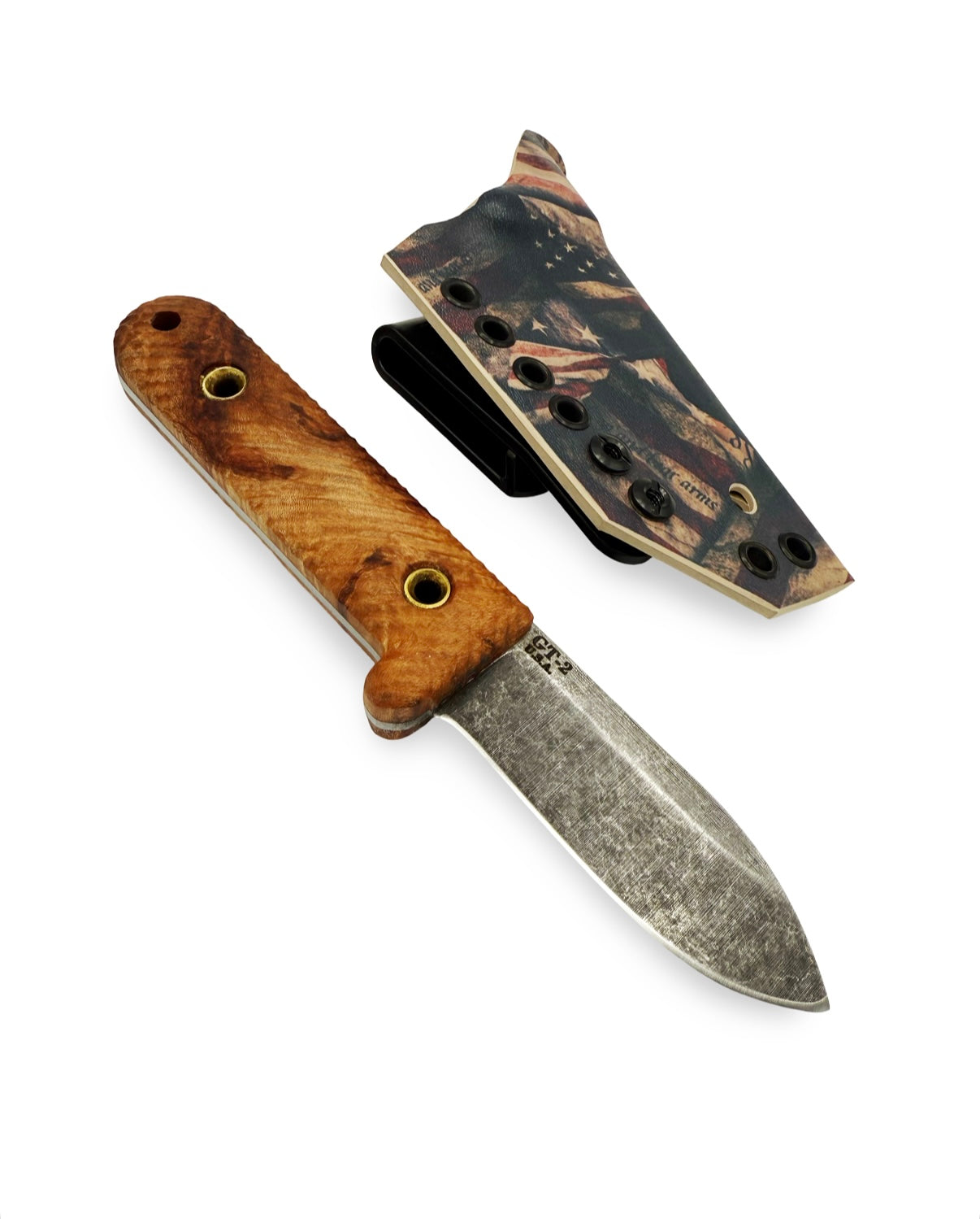 - Handle Scales: Stabilized Red Oak Crotch, Textured