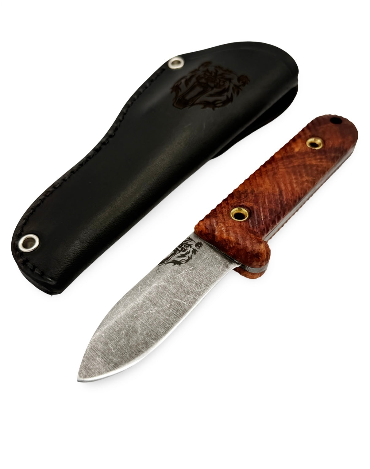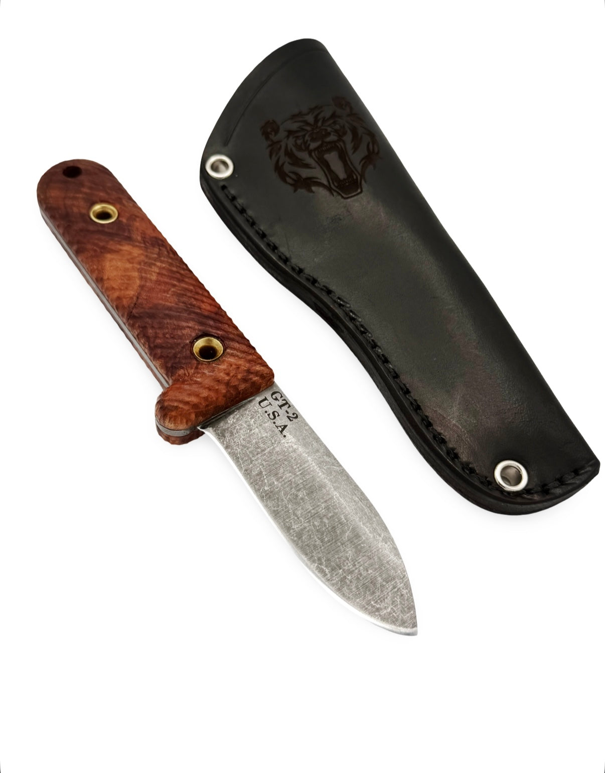 The GT‑2 returns tougher, sharper, and sized for bigger hands. Its 3.34” spear point blade, built from 80CrV2 high carbon steel, blends old‑school grit with modern versatility. For work gloves and larger hands, you’ll appreciate the hand-filling 4.5” handle. Our CNC‑milled Linen Micarta scales lock into your grip, while the acid wash rock tumble finish gives each blade a one‑of‑a‑kind, worn-in look. At 8” overall, the GT‑2 sits perfectly between the GT‑3 and The Simple, making it the ideal mid‑sized companion. Carry it with pride in a JRE Industries custom black leather sheath, crafted in the U.S.A. to match the knife’s rugged character.