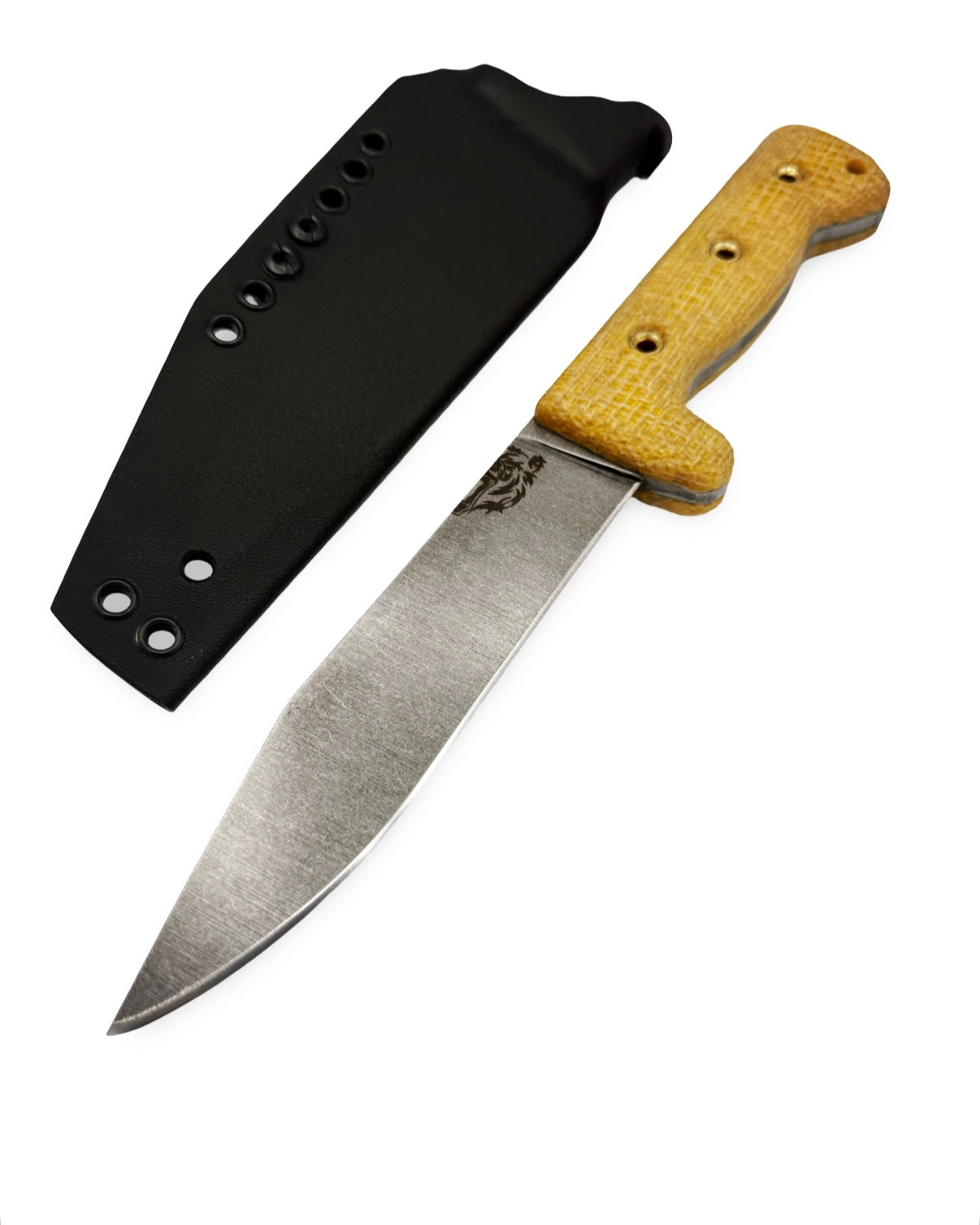 The Super Bear bridges the gap between belt knife and chopper. With a 12-inch overall length and a 6.5-inch blade of 80CrV2 carbon steel, it delivers reach and cutting power without excess bulk. The 0.187-inch thickness and full-flat grind provide strength and slicing efficiency, while the sharp 90-degree spine adds fire-starting utility. Rock Tumbled Acid Wash finish speaks to hard use, not hanging on the wall. A 5.5-inch handle with black and natural linen Micarta scales locks securely in hand. Carried in a rugged black KYDEX® sheath, the Super Bear is U.S.A. made and adventure-ready.