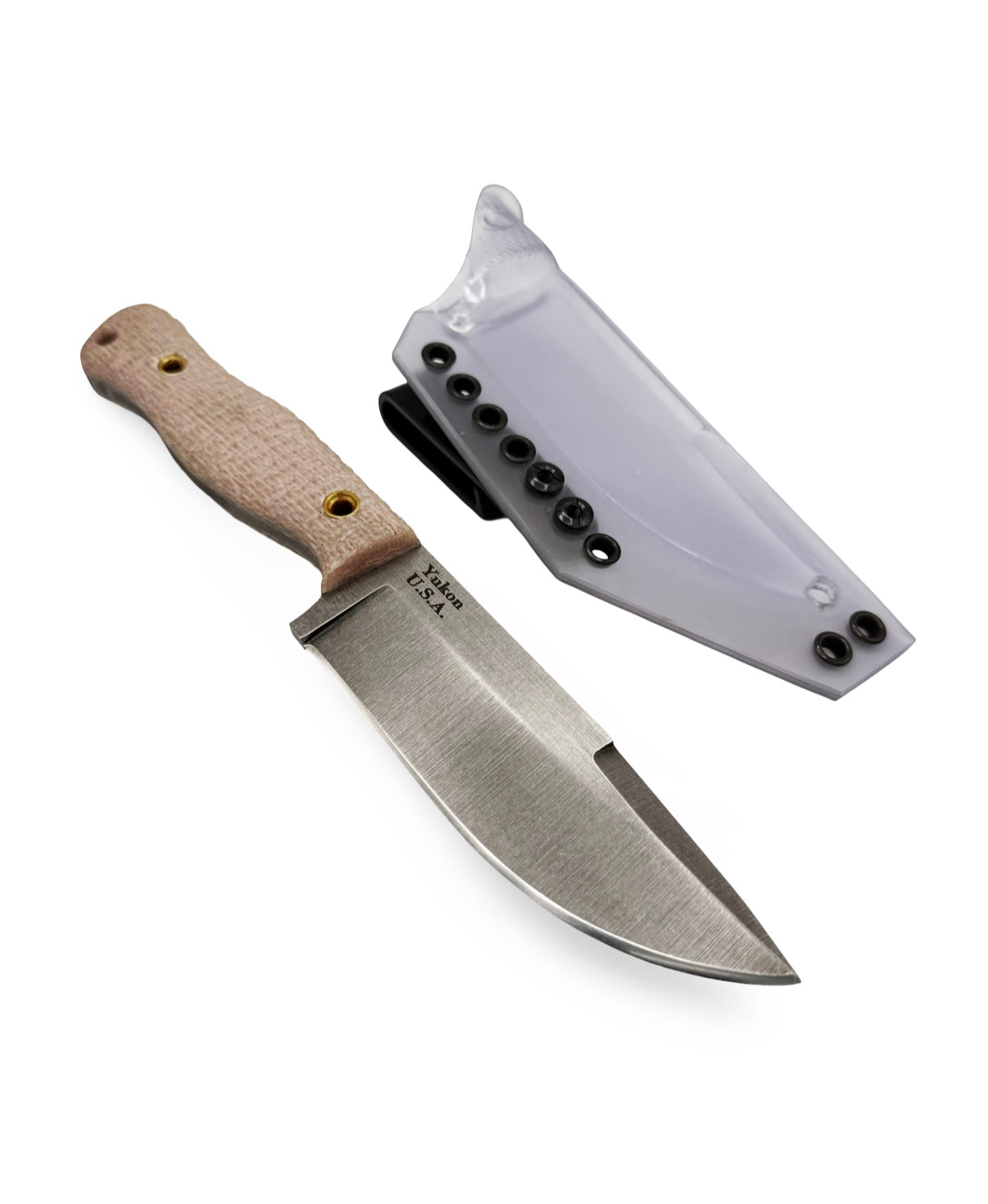 The Yukon knife is a high-quality tool built for the toughest of tasks. With a 5-inch blade and a thickness of .187 inches, this knife is perfect for heavy-duty jobs. The blade is made of 52100 high-carbon steel and features a Saber grind with a Swedge for excellent penetration. The 90-degree spine makes using the knife as a Ferro striker and tinder scraping tool easy, while the black linen Micarta handle scales provide a comfortable and secure grip. The knife's finish is a rock-tumbled acid wash, which gives it a unique and stylish look. Made in the USA, The Yukon knife is a reliable and durable tool that will last for years to come.