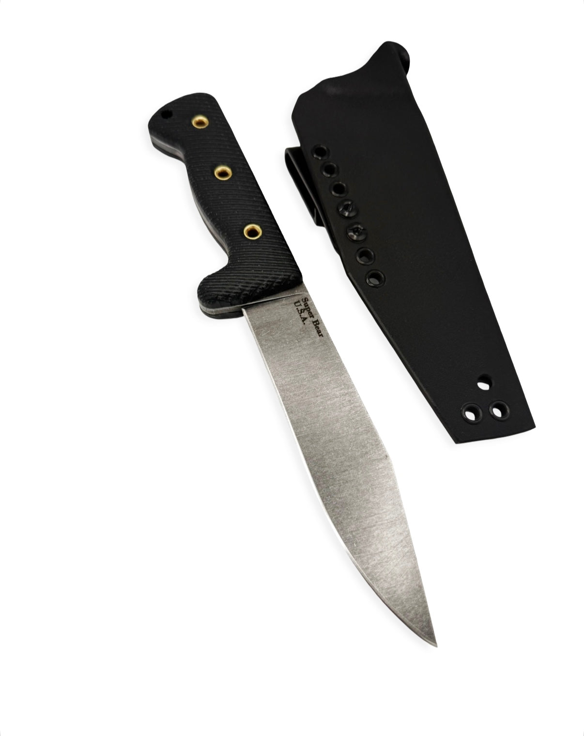 The Super Bear bridges the gap between belt knife and chopper. With a 12-inch overall length and a 6.5-inch blade of 80CrV2 carbon steel, it delivers reach and cutting power without excess bulk. The 0.187-inch thickness and full-flat grind provide strength and slicing efficiency, while the sharp 90-degree spine adds fire-starting utility. Rock Tumbled Acid Wash finish speaks to hard use, not hanging on the wall. A 5.5-inch handle with black and natural linen Micarta scales locks securely in hand. Carried in a rugged black KYDEX® sheath, the Super Bear is U.S.A. made and adventure-ready.